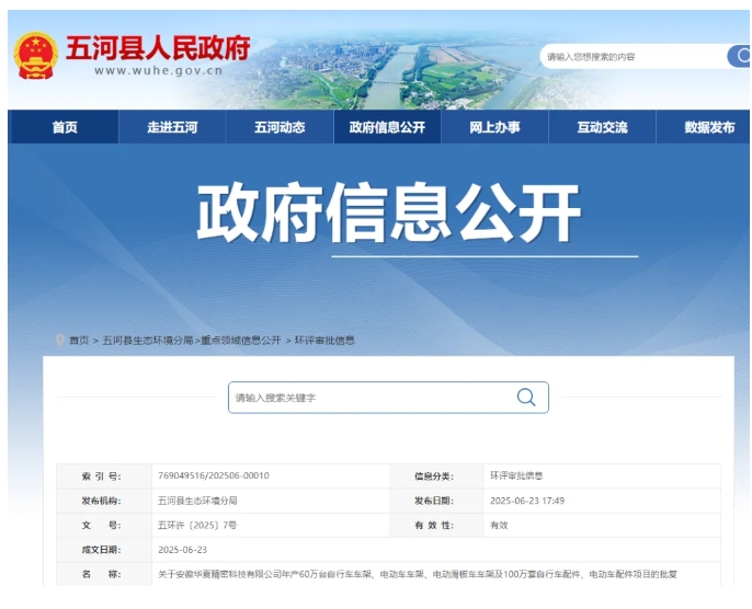你公司報送的《安徽華夏精密科技有限公司年產(chǎn)60萬臺自行車車架、電動車車架、電動滑板車車架及100萬套自行車配件、電動車配件項目環(huán)境影響報告表》(以下簡稱《報告表》,項目代碼2405-340322-04-05-115345)收悉。經(jīng)認(rèn)真研究,現(xiàn)批復(fù)如下: