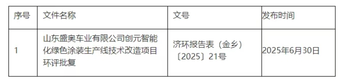 濟(jì)寧市生態(tài)環(huán)境局金鄉(xiāng)縣分局發(fā)布關(guān)于作出山東盛奧車業(yè)有限公司創(chuàng)元智能化綠色涂裝生產(chǎn)線技術(shù)改造項目批復(fù)的公告。