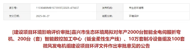 近日,嘉興市生態環境局發布擬對年產2000臺智能全電伺服折彎機、200臺(套)智能數控加工中心(鈑金柔性生產線)、10萬套制冷設備組及100套微風發電機組建設項目環評文件作出審批意見的公告。