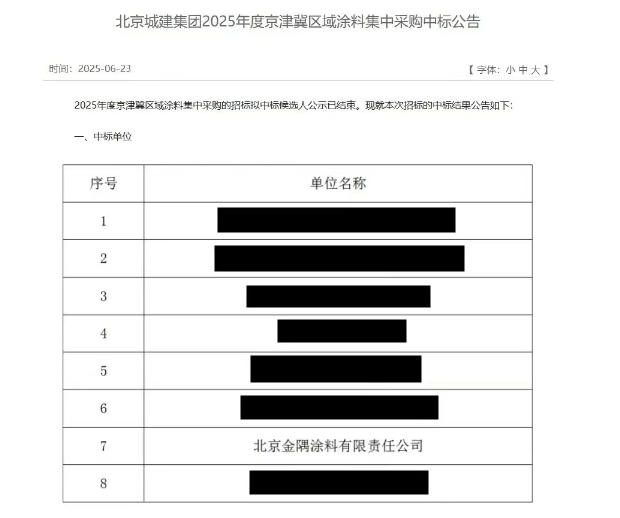 近日,北京城建集團正式對外發布了2025年度京津冀區域涂料集中采購項目的中標公告。在這場匯聚了國內外眾多涂料行業佼佼者的激烈角逐中,北京金隅涂料有限責任公司憑借其卓越的技術創新能力、全面且精細化的產品體系,以及在業界樹立起的良好品牌口碑,在這次群雄逐鹿的過程中脫穎而出,一舉中標北京城建集團2025年度京津冀區域的涂料集中采購項目。