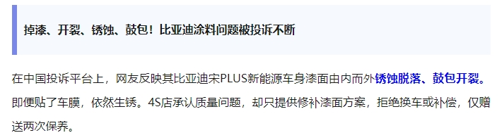 而據涂料采購網了解,在各類投訴平臺上,比亞迪確實因涂料問題被消費者頻頻投訴,涉及掉漆、開裂、銹蝕等。這背后是一眾車主艱難的維權,也揭開了這家民族車企“隱秘的角落”。