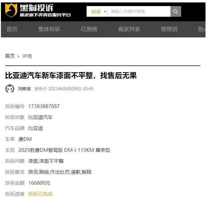 黑貓投訴平臺,有比亞迪2025款唐DM智駕版DM-i115KM尊榮型車主投訴漆面不平整,要求換貨、賠償等,涉訴金額166800元。