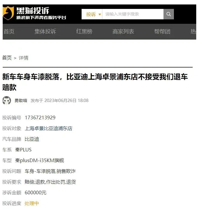 比亞迪秦PLUS DM-i35KM旗艦型車主稱車漆開裂,比亞迪拒不承認是自身車漆問題,消費者要求賠償、退款等,涉訴金額600000元。