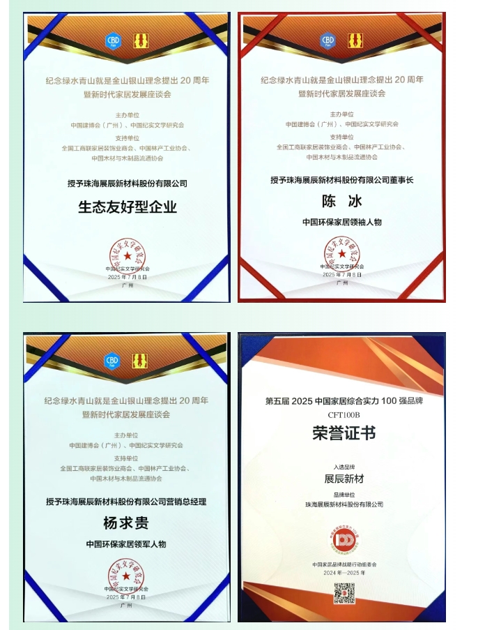 在“紀念綠水青山就是金山銀山理念提出20周年暨新時代家居發展座談會”上,展辰新材榮獲多項重磅榮譽:作為中國涂料行業唯一代表獲授“生態友好型企業”稱號;董事長陳冰榮膺中國涂料行業唯一“中國環保家居領袖人物”;營銷總經理楊求貴當選“中國環保家居領軍人物”;以唯一專業木器涂料品牌榮登“第五屆2025中國家居綜合實力100強品牌”榜單。