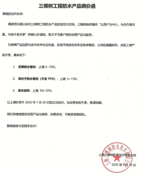 近日,上海三棵樹防水發布《三棵樹工程防水產品調價函》,其表示,為保障產品品質與合作伙伴長遠利益,促進市場良性競爭及秩序穩定,經慎重研究,7月20日起,決定上調產品價格,瀝青防水卷材上調5%—10%;高分子防水卷材(不含TPO)上調5%—15%;防水涂料上調5%—10%。