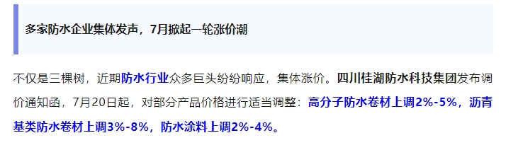 雨中情防水技術集團股份發布調價函告,稱7月15日起,對防水卷材及涂料產品上調價格,預計漲價幅度在3%-5%之間。