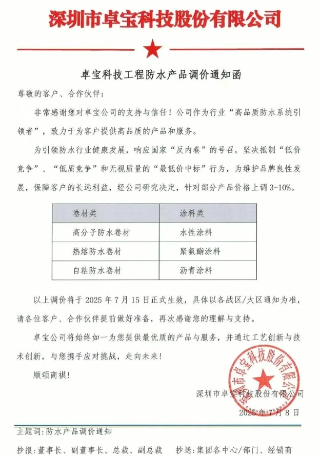 深圳市卓寶科技發布調價通知函,為引領防水行業健康發展,響應國家“反內卷”的號召,堅決抵制“低價競爭”“低質競爭”和無視質量的“最低價中標”行為,為維護品牌良性發展,保障客戶的長遠利益,7月15日起針對部分產品價格上調3%—10%。