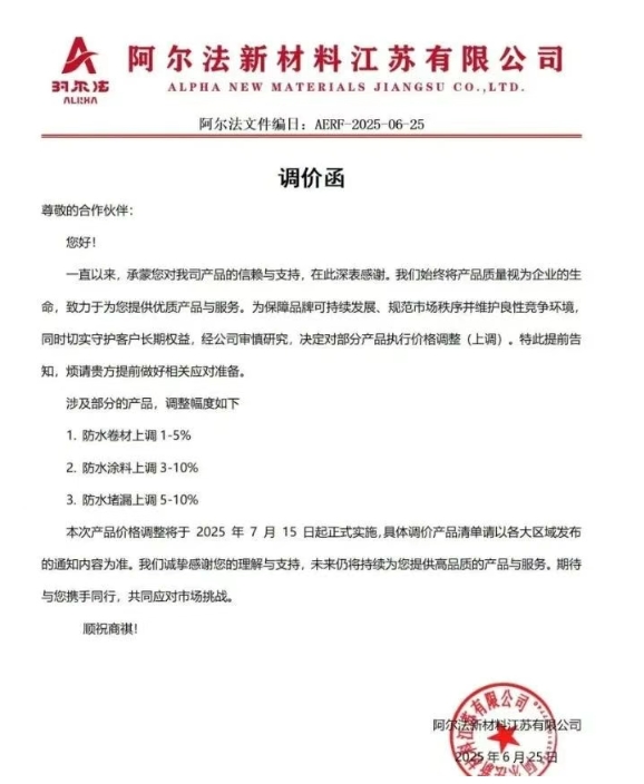 阿爾法新材料江蘇發布調價函,稱為保障品牌可持續發展、規范市場秩序并維護良性競爭環境同時切實守護客戶長期權益,經審慎研究,7月15日起,防水卷材上調1%-5%,防水涂料上調3%-10%,防水堵漏上調5%-10%。