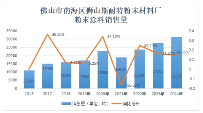 據(jù)涂料采購(gòu)網(wǎng)信息中心數(shù)據(jù)顯示,斯耐特除了2021年受疫情原因影響銷售量和銷售額下降以外,其余年份都實(shí)現(xiàn)了穩(wěn)步增長(zhǎng),其中2024年相較于2023年銷售量同比增長(zhǎng)14.55%,銷售額同比增長(zhǎng)12.22%。
