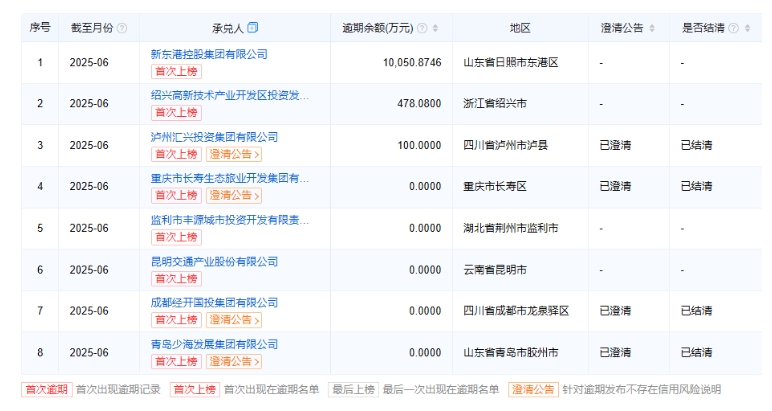 其中, 8家發債城投公司為首次上榜,分布在山東、浙江、四川、重慶、湖北、云南六省。新東港控股集團有限公司逾期余額為10050.8746萬元;紹興高新技術產業開發區投資發展集團有限公司逾期余額為478.08萬元。