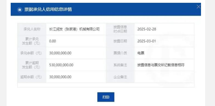 據 3月份數據, 長江潤發(張家港)機械有限公司 累計承兌金額 3000萬元,全部逾期未兌付。更嚴重的是,其歷史累計逾期金額已高達 5.3億元,目前票據新增承兌為0.業務疑似全面停滯。