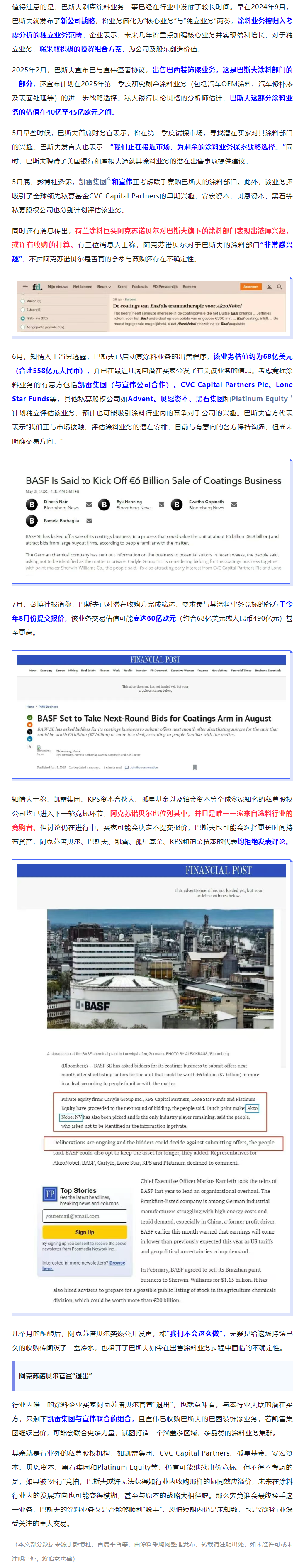 近日,外資涂料巨頭巴斯夫剝離涂料業(yè)務(wù)一事再起波瀾,據(jù)路透社報(bào)道,阿克蘇諾貝爾首席執(zhí)行官Greg Poux-Guillaume被問及“考慮收購(gòu)巴斯夫的涂料業(yè)務(wù)”時(shí)指出,“阿克蘇諾貝爾尚未承諾進(jìn)行任何這樣的程序。”其還表示“我們沒有這方面的資產(chǎn)負(fù)債表……而且我們現(xiàn)在不需要分心……巴斯夫正在尋求現(xiàn)金交易,而我們不會(huì)這么做。”這似乎體現(xiàn)出了阿克蘇諾貝爾對(duì)于收購(gòu)巴斯夫涂料業(yè)務(wù)的“婉拒”態(tài)度。