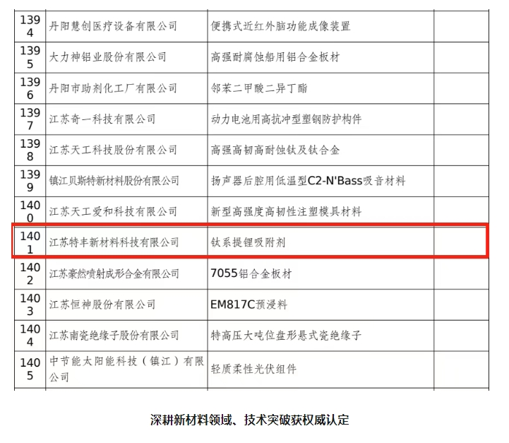 近日,江蘇省工業(yè)和信息化廳正式公示 2025 年度江蘇省 “三首兩新” 擬認定技術(shù)產(chǎn)品名單。經(jīng)過嚴格規(guī)范的評審流程,江蘇特豐新材料科技有限公司(以下簡稱 “特豐新材”)自主研發(fā)的核心產(chǎn)品 ——“鈦系提鋰吸附劑” 成功躋身 “兩新” 技術(shù)產(chǎn)品目錄。這一重要成果不僅是對特豐新材在新能源材料領(lǐng)域技術(shù)創(chuàng)新實力的權(quán)威認證,更標志著企業(yè)在關(guān)鍵材料自主研發(fā)賽道上的核心競爭力實現(xiàn)了新突破,為其深耕新能源產(chǎn)業(yè)、推動技術(shù)成果產(chǎn)業(yè)化奠定了堅實基礎(chǔ)。