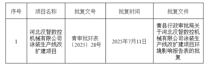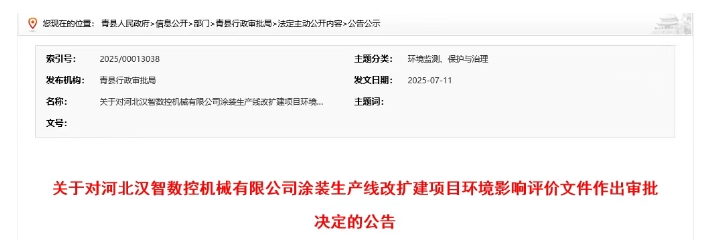 近日,青縣行政審批局發布關于對河北漢智數控機械有限公司涂裝生產線改擴建項目環境影響評價文件作出審批決定的公告。