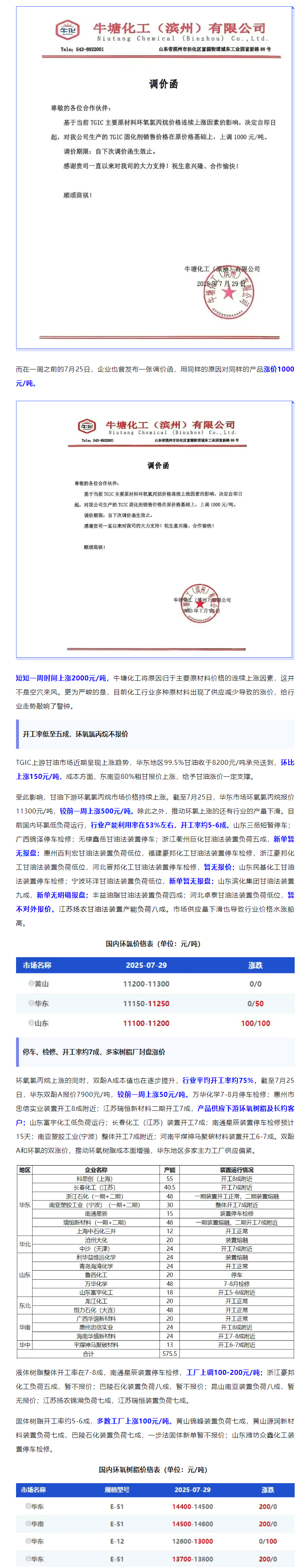 近日,牛塘化工(濱州)有限公司發(fā)布調(diào)價(jià)函稱,基于當(dāng)前TGIC主要原材料環(huán)氧氯丙烷價(jià)格連續(xù)上漲因素的影響,決定自7月29日起,TGIC固化劑銷售價(jià)格上調(diào)1000元/噸。