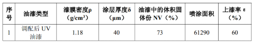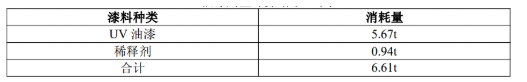 油漆、稀釋劑消耗量核算: 本項目使用的油漆為UV光固化漆。UV光固化漆使用時需添加稀釋劑進行稀釋后方可使用;油漆與稀釋劑的比例為6:1(重量比);油漆密度約為1.25g/cm3. 揮發(fā)份含量為15%,稀釋劑密度為0.86g/cm3.揮發(fā)份含量為100%。
