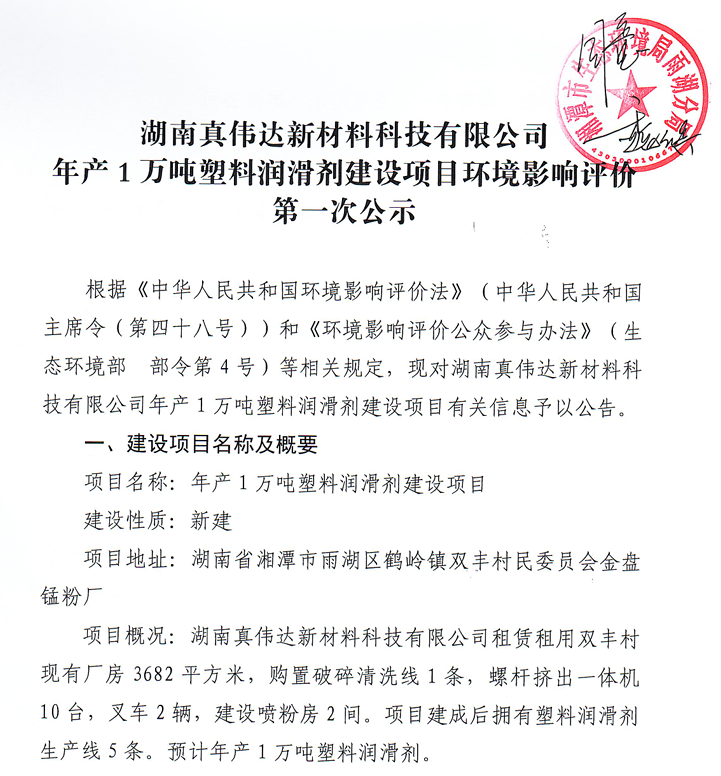 近日,雨湖區人民政府門戶網站發布湖南真偉達新材料科技有限公司年產1萬噸塑料潤滑劑建設項目環境影響評價第一次公示。