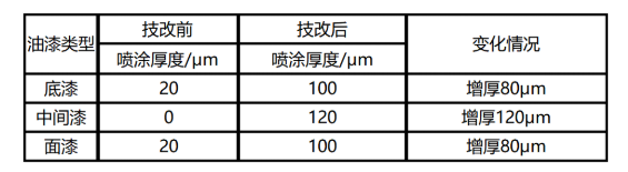 根據(jù)建設(shè)單位提供資料,廠區(qū)原有框架采用手動噴涂,本次項目由于產(chǎn)品需要出口,故部分框架采用自動噴涂;同時增加噴漆厚度,不改變噴漆面積,根據(jù)建設(shè)單位提供的資料,技改前后,框架的噴涂厚度變化情況如下表。