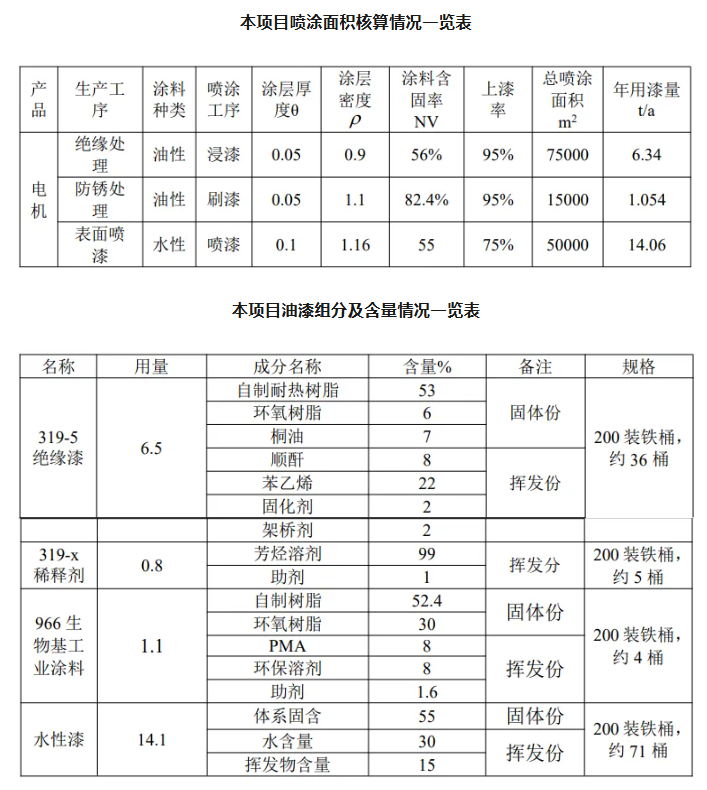 鐵桶規格為直徑580mm,高度900mm,總容積為237.6L。每個鐵桶裝油漆 裝319-5絕緣漆200L,高度為750mm,小于鐵桶總高度150mm符合。319-5 絕緣漆需要36桶,36*200*0.906=6.523.2噸,符合。319-x稀釋劑采用相同規格鐵桶,4桶總重量4*200*0.906=0.7244噸小于0.8噸,5桶總重量 5*200*0.906=0.906噸大于0.8噸,5桶用量符合。966生物基工業涂料采用相同規格鐵桶,6桶總重量4*200*1.42=1.136噸大于1.1噸,符合。水性漆采用相同規格鐵桶,71桶總重量71*200*1=14.2噸。符合根據以上分析,本項目理論319-5絕緣漆6.34 噸、319-x稀釋劑0.8噸966生物基工業涂料1.054噸、水性漆用量為14.06t/a,與建設單位提供的319-5絕緣漆6.5噸、319-x稀釋劑 0.8噸966生物基工業涂料1.1噸、水性漆用量為14.1t/a, 基本相符。
