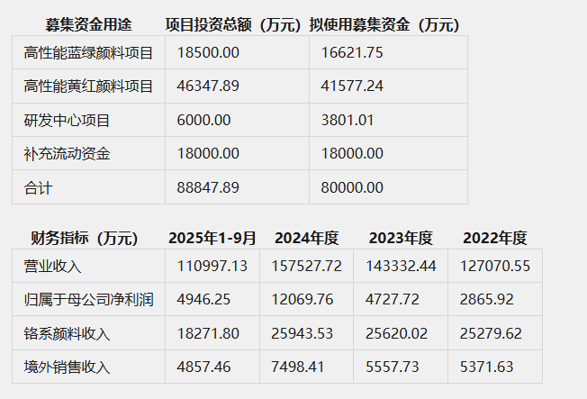 公告顯示,公司作為國內酞菁系列顏料龍頭企業,2024年酞菁顏料收入占主營業務收入比例達74.52%,國內市場占有率超過30%。但2025年1-9月公司業績出現下滑,營業收入11.10億元,同比下降4.94%;扣除非經常性損益后凈利潤同比下滑46.95%,主要受產品價格波動及原材料成本影響。公司提示,本次募投項目新增折舊攤銷金額達5392.20萬元/年,若項目效益不及預期,可能存在利潤下滑風險。
