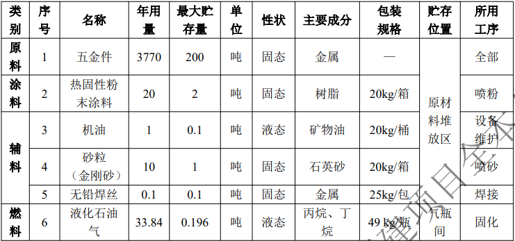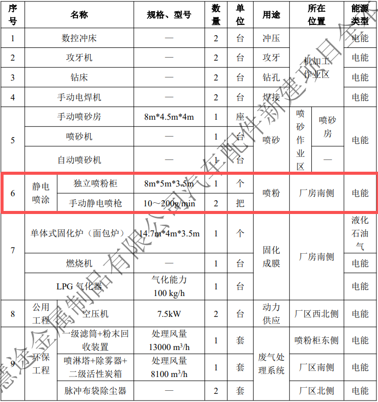 本項目以五金件為原料,以粉末涂料為工藝材料,以液化石油氣為供熱能源,采用機加 工工藝,靜電噴涂工藝進行專業(yè)表面涂裝加工,生產(chǎn)過程不涉及機械化學(xué)預(yù)處理(酸洗、堿洗、脫脂、水洗等)、轉(zhuǎn)化膜處理(磷化、鈍化、硅烷化、鋯化等)。