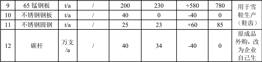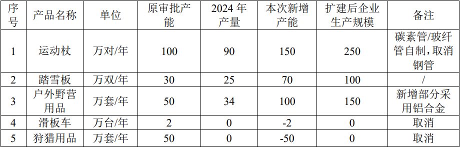(2)產(chǎn)能調(diào)整:增加運動杖、雪地行走鞋、戶外野營用品生產(chǎn)產(chǎn)能,其中運動 杖由100萬對/年擴(kuò)產(chǎn)到250萬對/年、雪地行走鞋由30萬雙/年擴(kuò)產(chǎn)到100萬雙/年、 戶外野營用品由50萬套/年擴(kuò)產(chǎn)到150萬套/年。