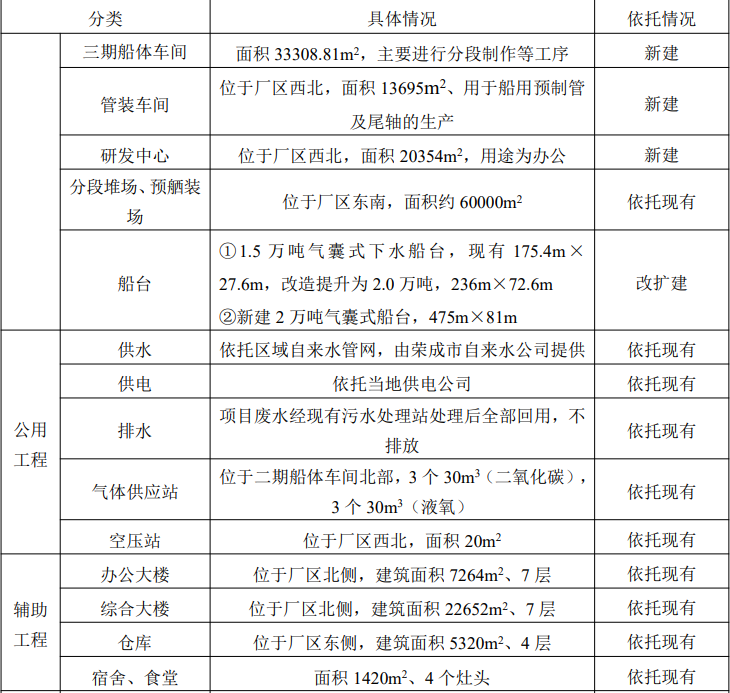 黃海造船有限公司擬投資48660萬元建設黃海造船有限公司船舶制造項目,項目位于榮成市石島管理區桃園街道青木寨村南,中心點位于122.469403°E、36.930211°N,現有廠區占地面積為259495m2.本項目新增用地面積為 41858m2.項目新增員工300人,項目新建2萬噸氣囊船臺、改造提升2萬噸氣囊船臺、新建三期船體車間、分段倉儲設施、研發中心、管裝車間;項目造船產能為7.98萬噸/年(47.8萬載重噸),利用榮成市神飛船舶制造有限公司置換13 萬噸/年(71萬載重噸)造船產能中的8萬噸/年造船產能(47.8萬載重噸),不新增造船產能。