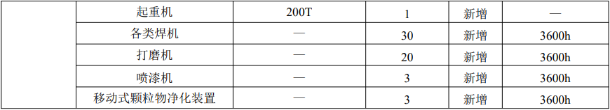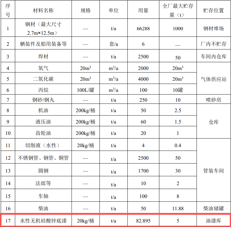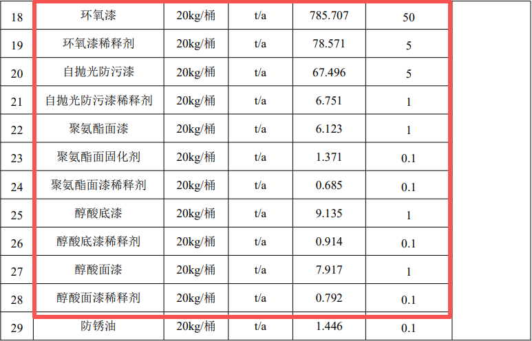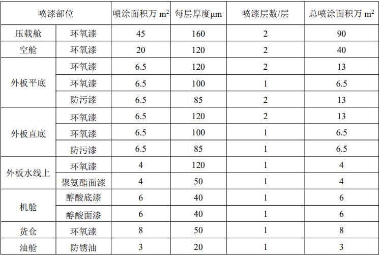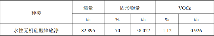 根據上式計算,油漆理論使用量(包含稀釋劑、固化劑等)分別為環24.954ta、防污漆5.098ta、聚氨酯面漆0.771ta,根據現有工程生產經驗,企業提供油漆用量分別為環氧漆26.643ta、防污漆5.481t/a、聚氨酯面漆0.879ta,本次環評采用企業提供的油漆等用量。