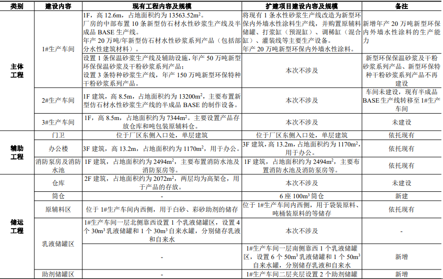 隨著市場發(fā)展需求,立邦新型材料(安徽)有限公司擬實(shí)施“立邦新型材料(安徽) 有限公司水性涂料技改項(xiàng)目”,將現(xiàn)有廠區(qū)內(nèi)1條水性砂漿生產(chǎn)線改造為新型環(huán)保內(nèi)外墻水性涂料生產(chǎn)線,并購置原輔料儲罐、打漿缸(預(yù)混缸)、調(diào)稀缸(混合缸)、灌裝 線等主要生產(chǎn)設(shè)備,改造現(xiàn)有管廊、儲運(yùn)系統(tǒng)等相關(guān)配套公輔設(shè)施。技改擴(kuò)建項(xiàng)目可實(shí) 現(xiàn)新增年產(chǎn)20萬噸新型環(huán)保內(nèi)外墻水性涂料的生產(chǎn)能力。通過調(diào)整工作班制(由單班制 [每班 8h、年工作300天]改為四班三運(yùn)轉(zhuǎn)制[每班8h、年工作300天])、延長現(xiàn)有水性 砂漿生產(chǎn)線運(yùn)行時(shí)間(由 2222h/a延長至 6667h/a),保持現(xiàn)有年產(chǎn)20萬噸/年新型仿石 材水性砂漿系列產(chǎn)品(包括部分水性建筑材料)生產(chǎn)能力不變。