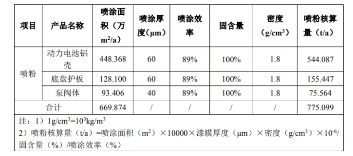 由上表計算結果可知,本項目熱固性粉末涂料用量為775.099t/a,本次評價 以熱固性粉末涂料用量775.099t/a,對污染物產排情況進行核算。 綜上,涂料使用量根據計算公式計算,經工程分析可知,本項目涂料的理論用量與企業提供的各漆種用量基本吻合,本環評污染源廢氣產排情況計算以核算用量為準。