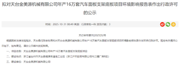 近日,天臺縣人民政府發(fā)布擬對天臺金美源機(jī)械有限公司年產(chǎn)16萬套汽車面板支架底板項(xiàng)目環(huán)境影響報告表作出行政許可的公示。