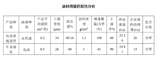 對于電池系統部件,采用的油漆種類為水性漆。其產品平均面積為每套0.2平方米,干膜厚度達到34微米,固含量占比49.16%,涂料密度為1.1克每立方厘米。年噴漆數量為100萬件,上漆率為60%。理論漆量需求為25.36噸每年,而企業提供的用量是26噸每年,判定為合理。