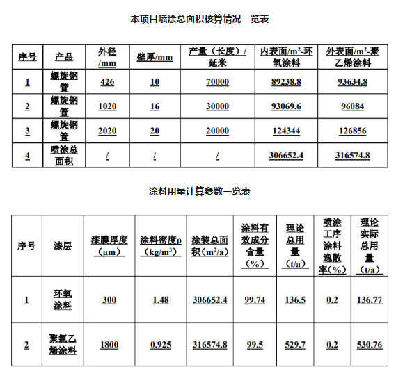 根據上表可知,環氧涂料、聚乙烯涂料理論總用量分別為136.5t/a、529.7t/a,又噴涂環節為密閉負壓狀態,產生的顆粒物通過收集后,引入脈沖袋式除塵器進行 收塵,收集后的涂料,又會回用于生產。根據項目源強核算,涂料的逸散率為0.2%, 則項目環氧涂料、聚乙烯涂料理論實際總用量分別為136.77t/a、530.76t/a。 建設單位提供的環氧涂料、聚乙烯涂料使用量分別為137t/a、532t/a,與計算所 得環氧涂料、聚乙烯涂料理論實際總用量差別不大。項目考慮到其他物料損失環節,如粉料的撒、漏,本次評價采用建設單位提供的涂料使用量數據進行評價。