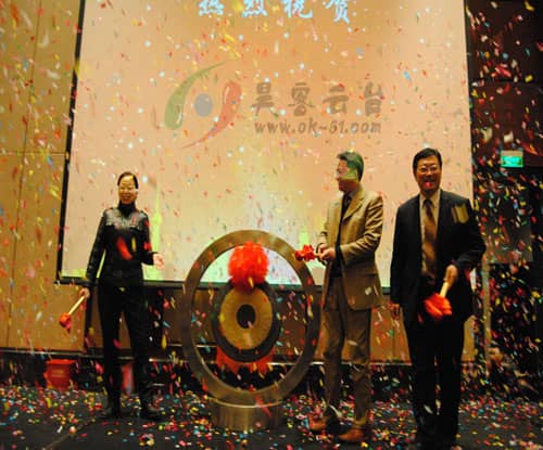 攀枝花市委常委艾磊(右一)、中涂協(xié)孫蓮英會(huì)長(zhǎng)(左一)與董事長(zhǎng)童曉宇(右二)為昊客云臺(tái)開鑼