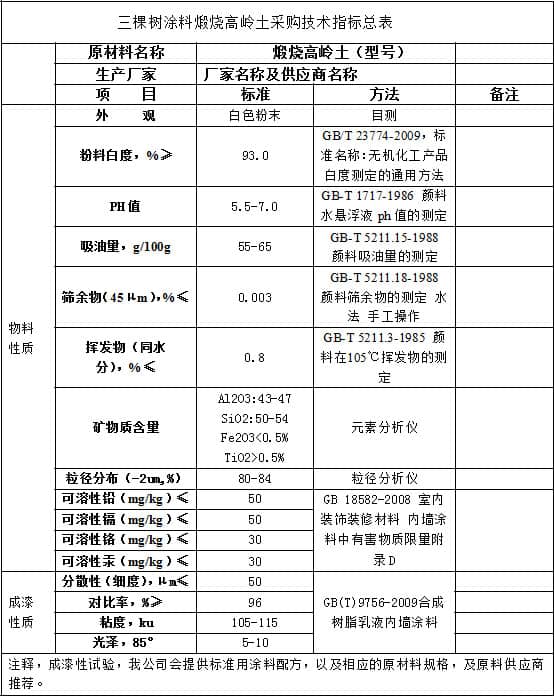 三棵樹涂料煅燒高嶺土類采購技術指標