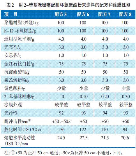 表2 用2-苯基咪唑啉配制的環(huán)氧聚酯粉末涂料的配方和涂膜性能