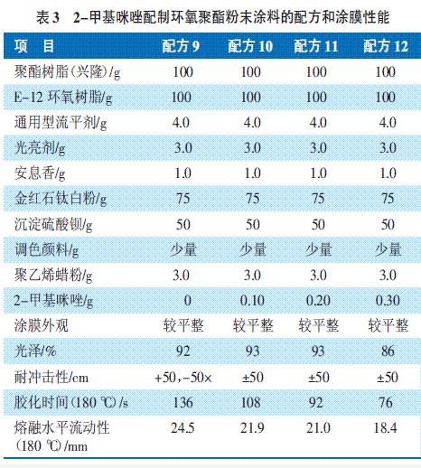 表3 用2-甲基咪唑配制環(huán)氧聚酯粉末涂料的配方和涂膜性能