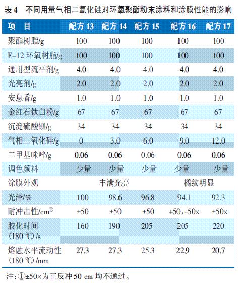 表4的試驗(yàn)結(jié)果表明,隨著氣相二氧化硅用量的增加,涂膜的流平性變差,涂膜光澤下降,涂膜的耐沖擊性也變差,當(dāng)用量增加至一定程度后正反耐沖擊性都通不過。對(duì)粉末涂料來說,隨著氣相二氧化硅用量的增加,粉末涂料的膠化時(shí)間變長,而粉末涂料的熔融水平流動(dòng)性變小,說明通過調(diào)整配方中氣相二氧化硅的用量,使粉末涂料的邊角覆蓋力得到改進(jìn),但添加的量要根據(jù)涂膜機(jī)械性能的要求決定,添加過多會(huì)影響涂膜的機(jī)械性能。