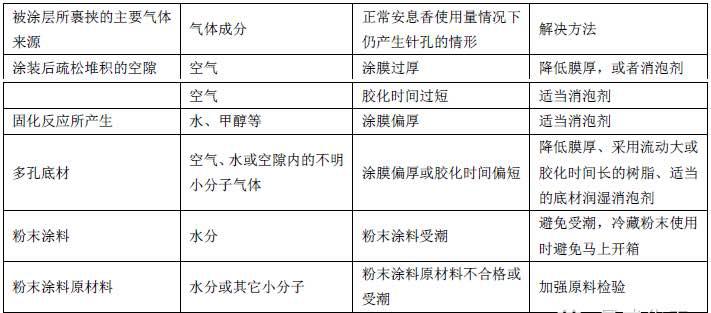 (凹部),而低黏度高表面張力的流體則上升至漩渦的周邊(凸部),直至固化完成。在此過程中,涂裝后原有松散堆積空隙內的氣體(空氣)會在粉末熔融塌陷的過程中聚集形成氣泡被排出,來自于涂層內部或者底材的小分子氣體也會聚集形成氣泡并被排出。隨著固化進行體系黏度的不斷加大,那些被裹挾于貝納德漩渦的氣泡在排出過程中最終形成針孔。因此,要預防和消除粉末涂料的針孔,就是要分析涂層內小分子(氣泡)產生的根源,然后對癥下藥,預防和解決涂膜針孔缺陷。