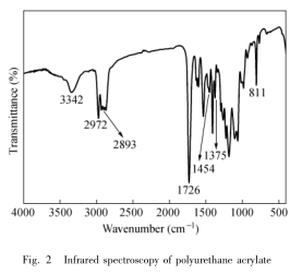 圖 2 為聚氨酯丙烯酸酯的紅外譜圖,其中3342 cm-1 和 1726 cm -1 為氨酯基特征峰,在 3480~3550 cm-1 沒有出現譜峰,表明了聚丙二醇的端羥基已經完全與二異氰酸酯反應?生產了氨酯基團,2893 cm-1 和 2972 cm -1 為季戊四醇三丙烯酸酯上的—CH 2 的伸縮振動峰,811 cm-1 為 2?4 ̄甲苯二異氰酸酯上苯環上的 C—H 振動吸收峰,1375 cm-1 為聚丙二醇結構上—CH3彎曲振動峰1454 cm-1 為聚丙二醇結構上—CH 彎曲振動峰,充分表明聚氨酯丙烯酸酯已經生成.