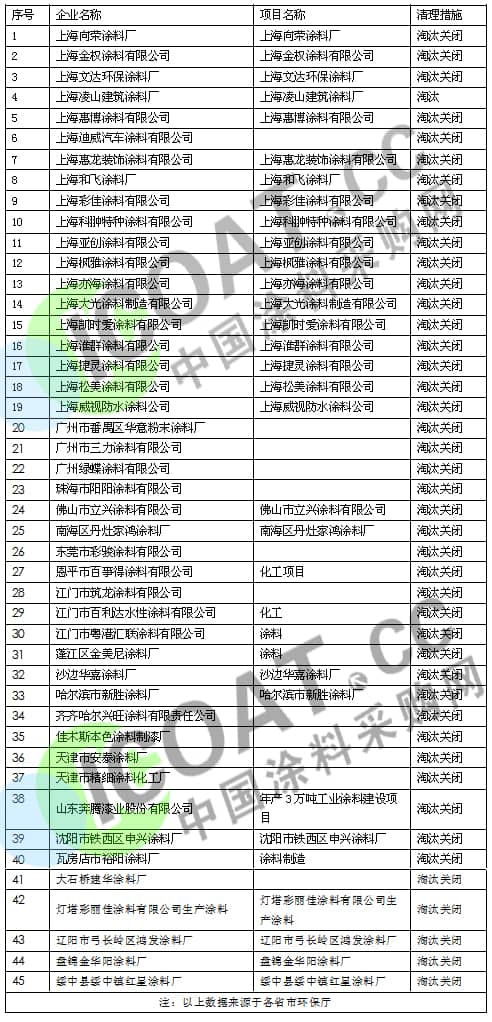 【中國涂料采購網】近期涂料企業怨聲載道,上游原材料不停的漲價、下游對用戶提價又提不上去,還被拖欠貨款。外加環保違規關閉項目、罰款等等,都令涂料企業內憂外患,僅環保違規問題,2016年被關閉的項目與企業就達上千家,這給整個行業造成了較大的影響,很多企業被罰關停,致使原材料的貨款都收不回來。在環保問題日趨嚴重的今天,中國涂料采購網整理了上海、廣東部分省市被關閉的涂料項目名單如下。