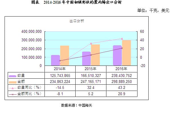 2014-2015年,我國初級形狀的聚丙烯出口總額由234,863,224美元增長到247,165,171美元,增長了5.2%;2016年,我國初級形狀的聚丙烯出口總額為298,889,250美元,比上年同期增長20.9%。