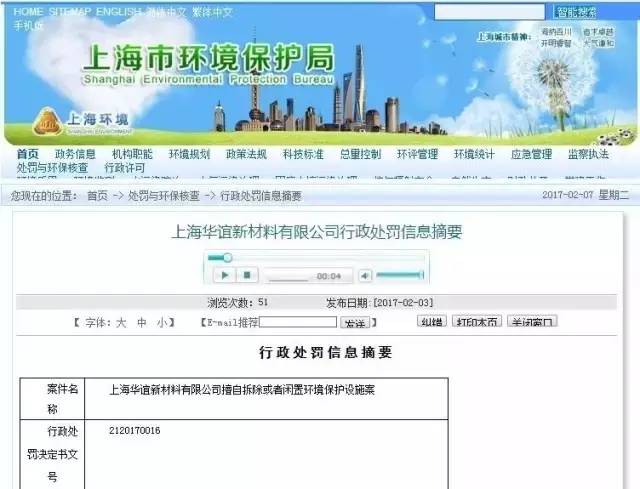 上海華誼新材料被上海市環保局罰款8萬元